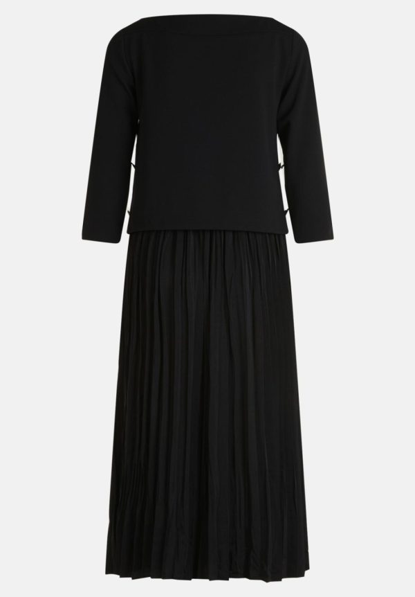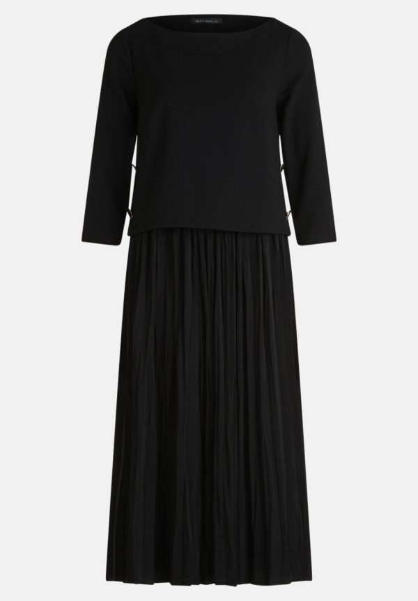 Das Jerseykleid in figurumspielender Form kombiniert schlichte Eleganz mit hohem Tragekomfort. Der Plisseerock und das kastig geschnittene Oberteil verleihen dem Kleid seine Besonderheit. Ohne Verschluss und in Uni-Design gehalten,eignet es sich ideal für festliche Anlässe. Ein zeitloses Kleid für stilvolle Auftritte!