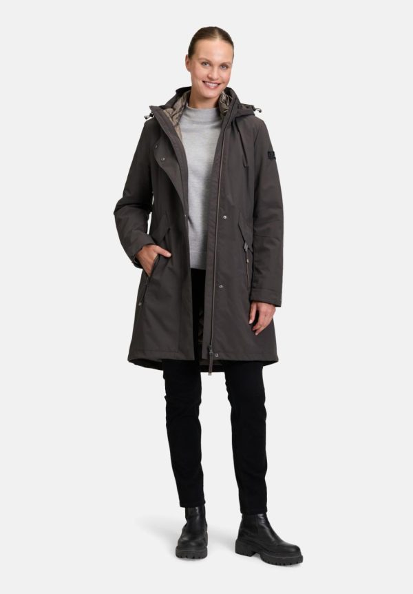 Sportliche 3-in-1-Jacke mit abnehmbarer,weitenregulierbarer Kapuze und herausnehmbarem Innenleben,das sich auch separat tragen lässt. Das wasserabweisende Material schützt zuverlässig bei jedem Wetter,während die leicht taillierte Passform eine feminine Silhouette betont. Mit Stehkragen,Zweiwege-Reißverschluss und Druckknöpfen wird die unifarbene Jacke zum idealen Begleiter für Freizeit,Sport und Reisen.